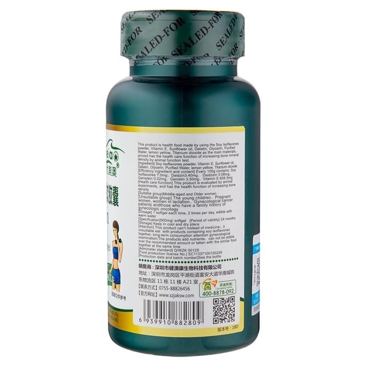 优美澳大豆异黄酮维E软胶囊 配料表:大豆异黄酮、维生素E、葵花籽油、明胶、甘油、水、柠檬黄、二氧化钛。 标志性成分及含量:每100g含:大豆异黄酮(以金雀异黄素计)55.2mg、维生素E 608.5mg。 保健功能:增加骨密度。 适宜人群:中老年女性。 不适宜人群:少年儿童。 食用方法及食用量:每日2次,每次1粒,温水送服。 规格:30克(500毫克/粒×60粒)。 保质期:24个月。 生产日期及批号:见瓶身。 贮藏方法:置阴凉干燥防潮处。 注意事项: 本品不能代替药物;本品添加了营养素,与同类营养素同时食用不宜超过推荐量 本品是以大豆异黄酮、维生素E、葵花籽油、明胶、甘油、水、柠檬黄、二氧化钛为主要原料制成的保健食品,经动物功能试验证明,具有增加骨密度的保健功能。 零售价:¥168.00元。 支持批发。...