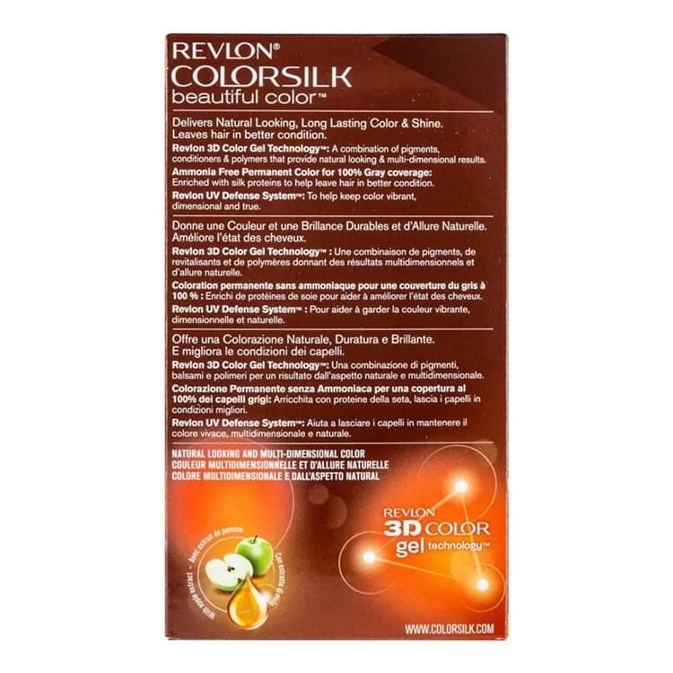 Revlon® 露华浓 丽然染发剂 采用 3D 三维颜色科技,配以特制的混合染料,护发素和聚合物,为头发提供自然,亮丽颜色,令秀发更具层次感,更立体。效果:发色完全改变,自然,亮丽立体有光泽。 不含阿摩尼亚,性质温和。丝质蛋白、苹果萃取物深入渗透每条发丝,令染后发质更柔滑、健康、亮丽,发质比染发前更好。