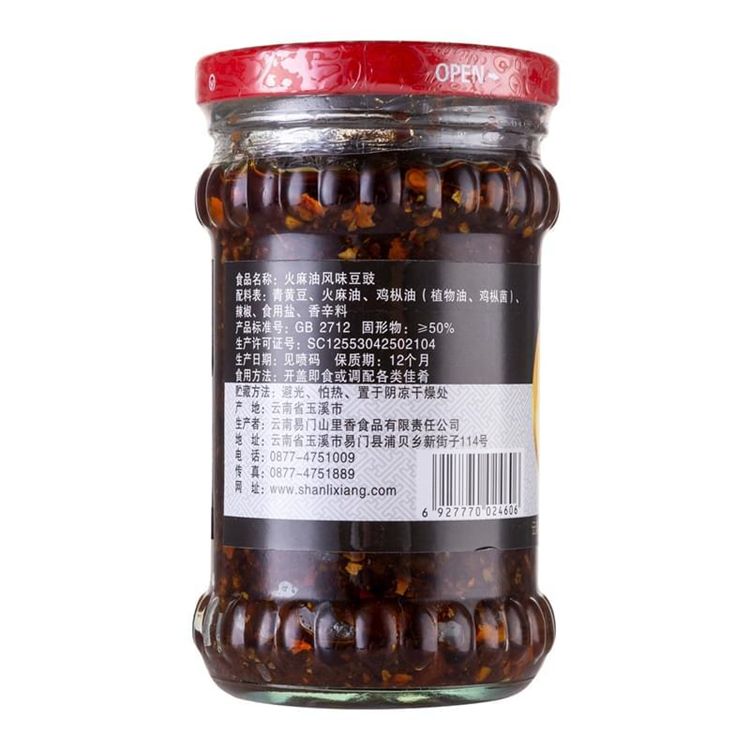 配料表:青黄豆、火麻油、鸡枞油(植物油、鸡枞菌)、辣椒、食用盐、香辛料等。