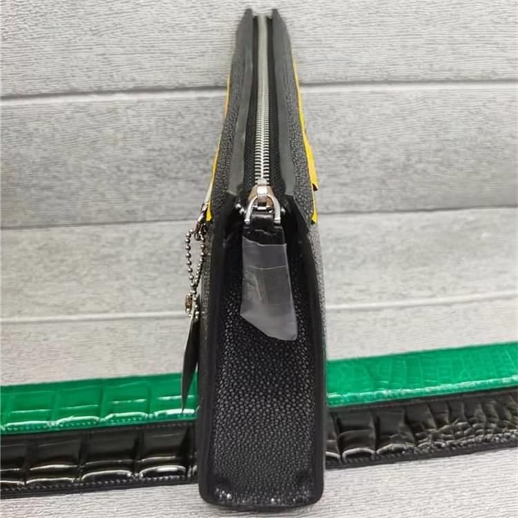 秾福稀有皮高端包包定制#8048 男士珍珠鱼皮手包 精选颗粒均匀珍珠鱼皮鱼皮简单大气,多卡位多隔层设计。 规格:27X18X6 支持:小牛皮、羊皮内里定制。 支持:全钢五金、蜡线缝制工艺定制。 支持:鳄鱼皮、蟒蛇皮、鸵鸟皮、蜥蜴皮、珍珠鱼皮定制。 支持:黑色、咖色、紫色、黄色、灰色、喜马拉雅白等等多种擦色定制。...