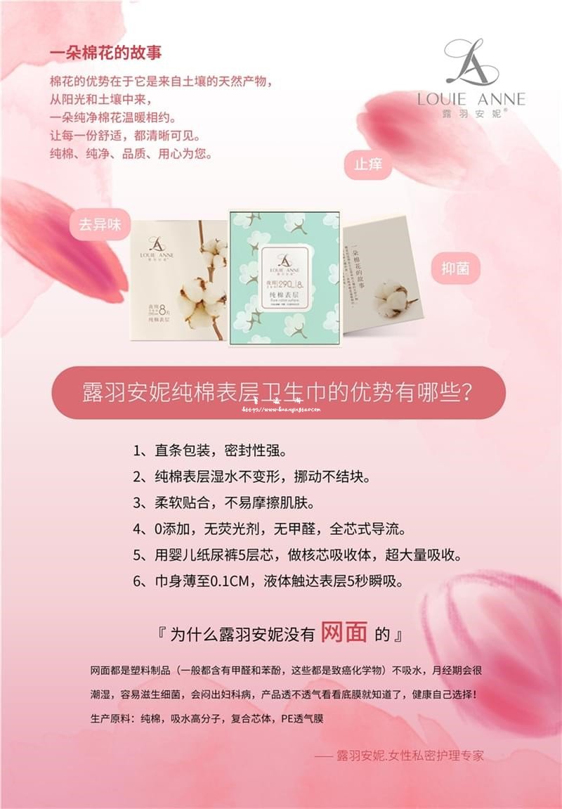 露羽安妮纯棉悬浮日用卫生巾 纯棉表层悬浮芯体不变形不回渗 1 、表层采用新疆长绒棉,具有很好的抑菌效果和低敏性,柔软贴合,不易摩擦肌肤; 2 、采用日本住友 300g 婴儿芯体做全...
